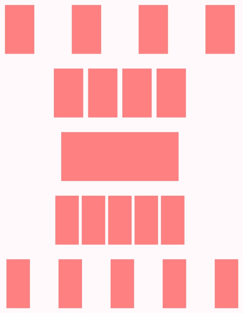 Das, was auf dem rechts stehenden Bild passiert, können wir uns dynamisch so vorstellen: \(4\) Rechtecke werden zu einem Rechteck horizontal zusammengeschoben, dann wird dieses Rechteck in \(5\) Rechtecke geteilt und diese werden horizontal auseinandergezogen.