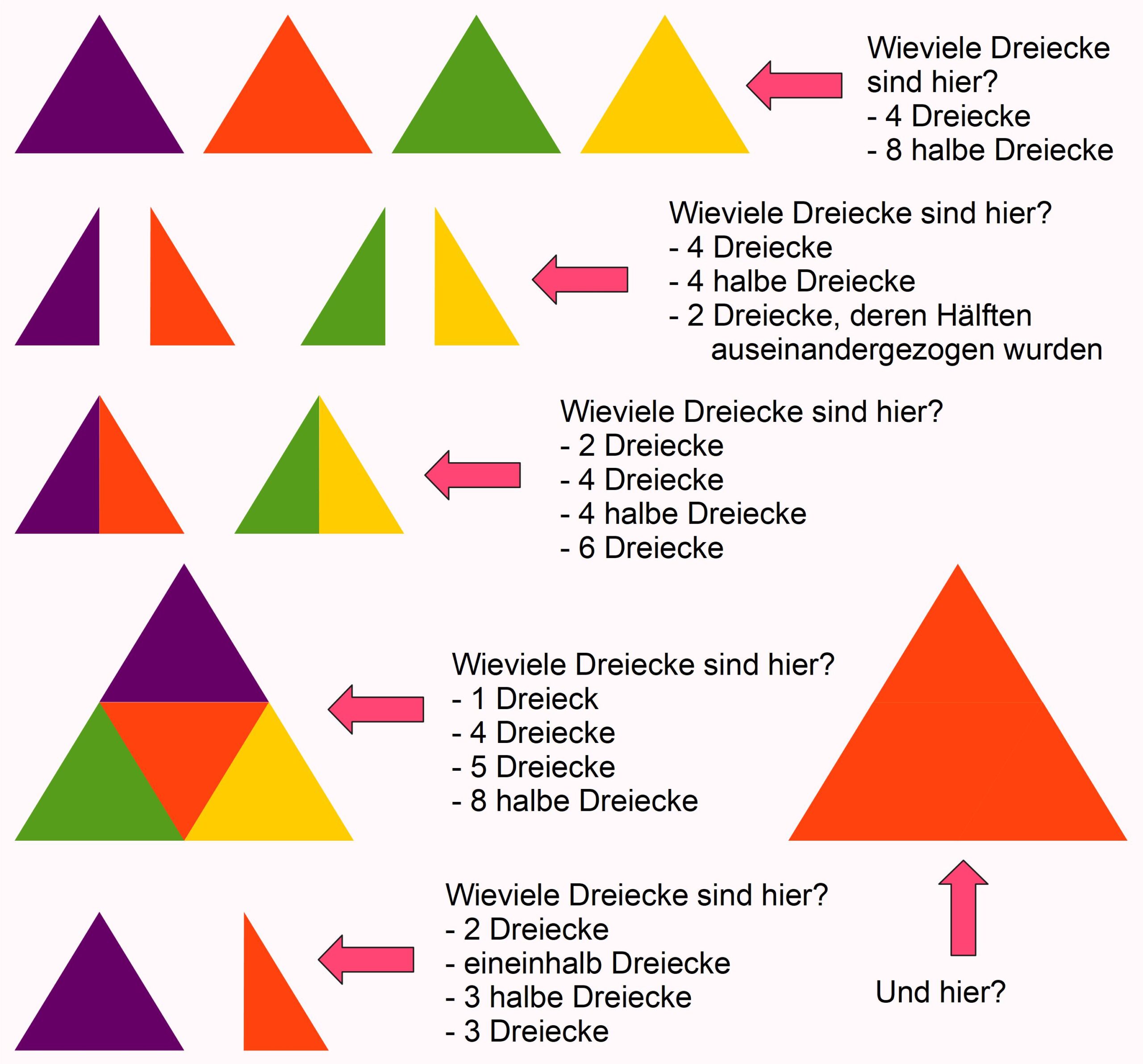 Wenn wir das mit z. B. Dreiecken machen, wird es noch lustiger, denn wir können Dreiecke so halbieren, dass die Hälften Dreiecke sind. Wenn wir dann vier Hälften addieren, sind das entweder vier Halbe, also \(2\), oder einfach vier Dreiecke, also \(4\), oder wir können jeweils zwei Hälften zu einem Dreieck zusammenfügen und beide Dreiecke addieren, was wieder \(2\) ergibt, aber nicht deshalb, weil wir vier Hälften, sodern zwei Ganze addiert haben.