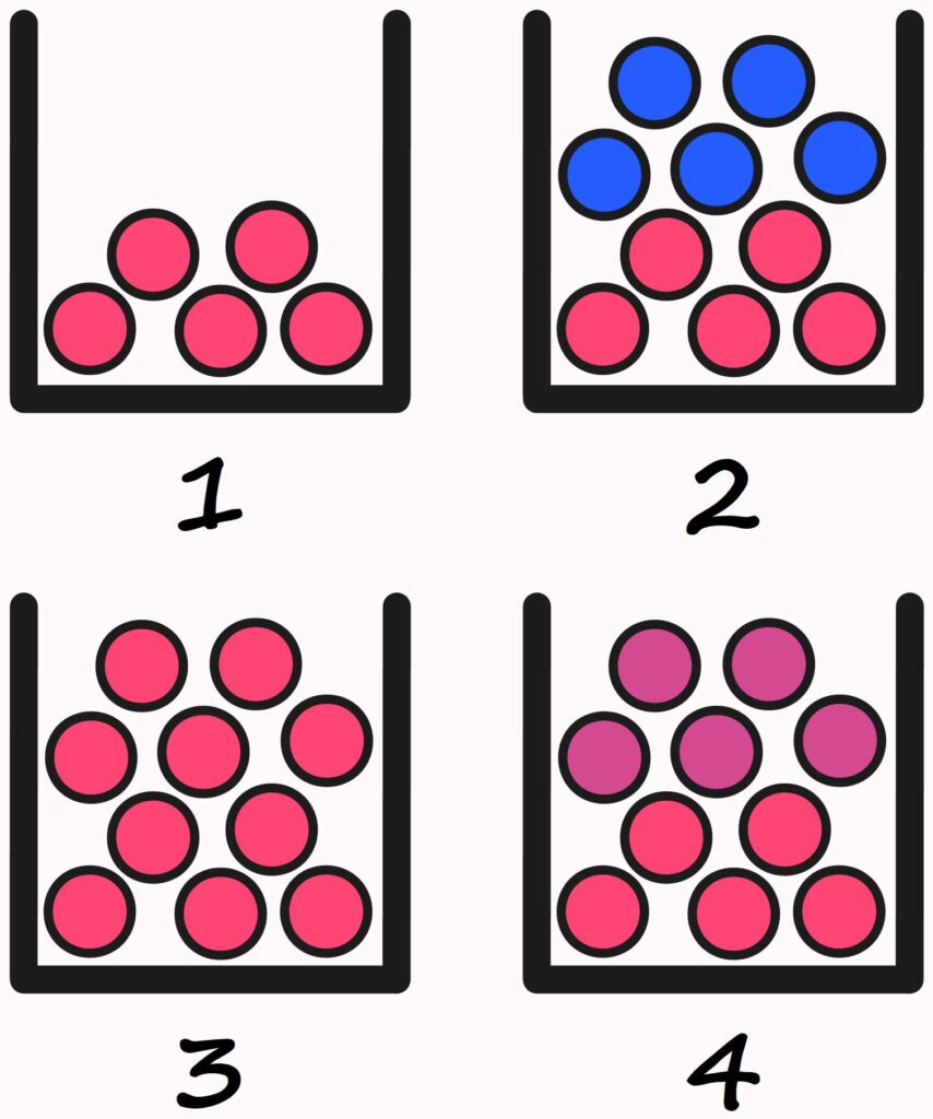 Befinden sich in Box \(4\) \(5\) rote Kugeln? Das hängt davon ab, ob wir dort zwei unterschiedliche Farben von Kugeln sehen oder ob wir \(10\) Kugeln in zwei verschiedenen Rottönen sehen. Das wirft die grundsätzliche Frage auf, inwieweit sich Elemente einer Menge unterscheiden müssen, um zu unterschiedlichen Teilmengen gehören zu können. Auch diese Frage können wir nicht grundsätzlich klären. In diesem Fall hängt das auch davon, wie deutlich der jeweilige Betrachter Farbunterschiede wahrnimmt oder auch davon, wie deutlich der jeweilige Bildschirm Farben nuanciert.