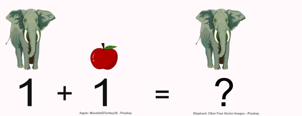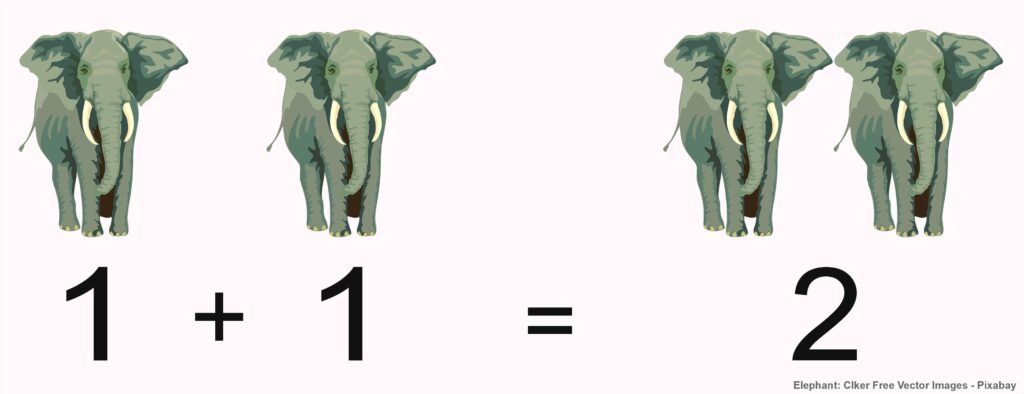 Die beiden „Elefanten“ auf der linken Seite der Abbildung können wir auch als Symbole für Elefanten verstehen. Da wir ohnehin keine realen Elefanten zählen, sondern uns aufgrund des Bildes das Zählen von Elefanten nur vorstellen, könnten wir die Abbildung als gelungene Repräsentation von \(1+1=2\) werten. Trotzdem fühlt sich die Abbildung falsch an, weil es so aussieht, als käme etwas anderes heraus als wir hineingetan haben. Andererseits könnte man argumentieren: Wenn es doch nur um die Quantität geht, ist es doch egal, welcher Art die Dinge des Ergebnisses sind, solange die Anzahl gleich \(2\) ist. Es könnten also auch Bauklötze herauskommen, ohne dass die Rechnung falsch wird. Kurz gesagt werden wir nicht klären können, ob die Addition wie abgebildet funktioniert oder nicht.