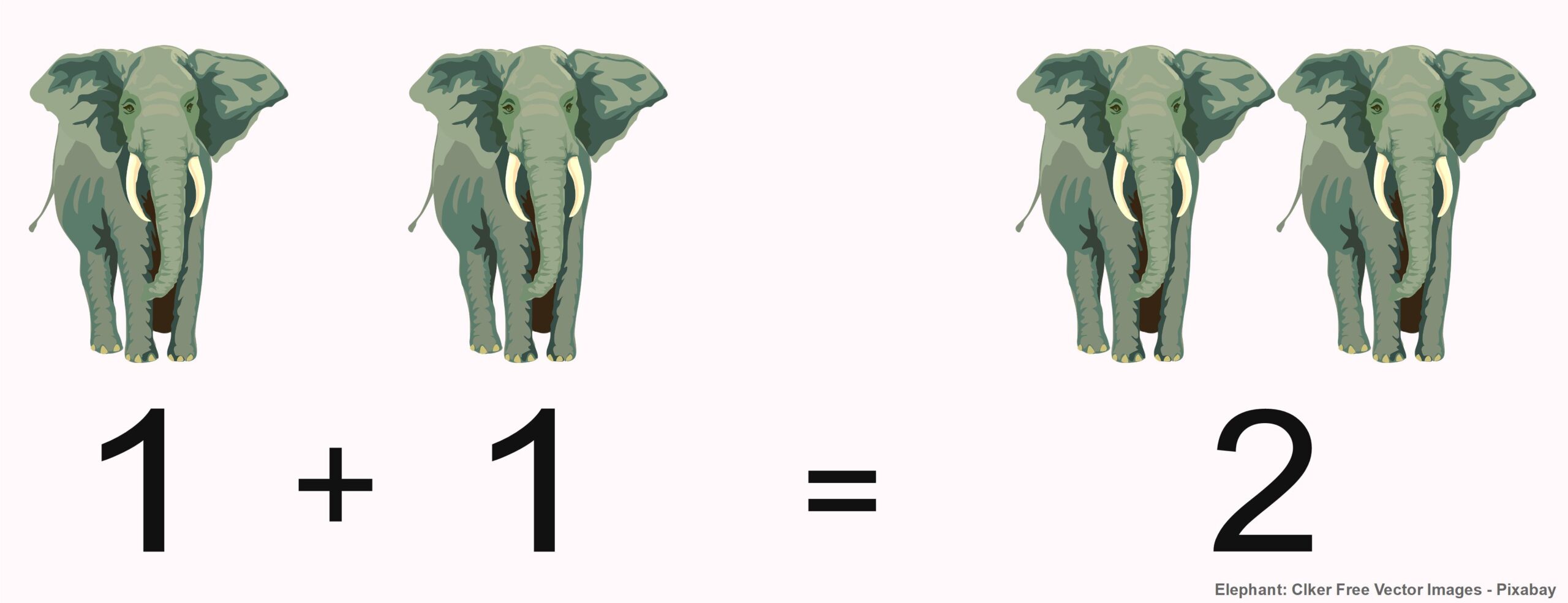Das nebenstehende Bild könnte die Aussage veranschaulichen: Ein Elefant und noch ein Elefant sind zwei Elefanten. Aber woher wissen wir das? Die meisten Menschen – zumindest von denen, die diesen Satz lesen – haben noch nie in ihrem Leben reale Elefanten gezählt. In der Schule wird das Zählen und Rechnen mit vielen unterschiedlichen Materialien unterrichtet, typischerweise mit Würfeln, Legeplättchen, Zahlenstäben und vielleicht auch mit Äpfeln und Birnen. Um also in diesem Bild eine Addition zu erkennen, müssen wir uns zu der etwas ulkigen Aussage durchringen können, Elefanten seien genauso wie Äpfel und Birnen – zumindest was deren Zählbarkeit angeht. Um diese Aussage ernsthaft vertreten zu können, müssen wir sie mit unserem gesunden Menschenverstand von allerlei Unfug unterscheiden können, der im Folgenden gezeigt werden soll.
