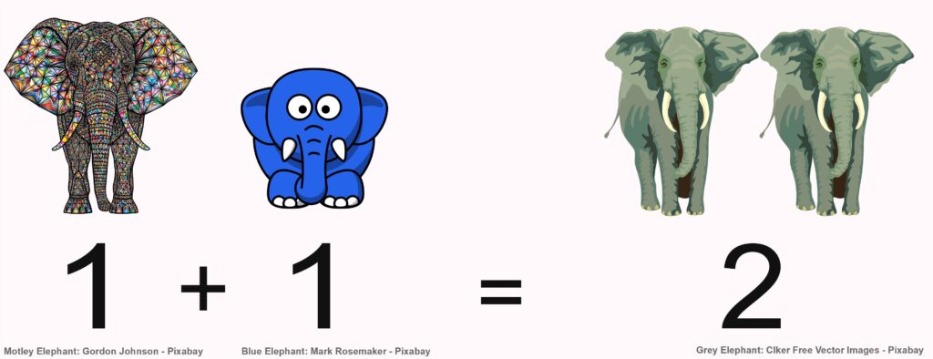 Es gibt keine Elefanten, die den ersten beiden Abbildungen entsprechen. Können wir sie trotzdem addieren? Ernstgemeinte Frage: Inwiefern müssen Dinge existieren, wenn wir sie addieren wollen? Können wir auch Fantasievorstellungen addieren? Wir sagen manchmal: „Ich habe gerade zwei Gedanken auf einmal.“ Also kann man Gedanken zählen? Müssen sie dafür gleichzeitig gedacht werden oder reicht es auch, wenn sie nacheinander auftreten? Wir werden diese und ähnliche Fragen nicht abschließend klären können. Sie zeigen aber, dass die Aussage „Eins und Eins ist Zwei.“ nicht unumstößlich wahr sein kann, wenn wir noch nicht einmal festlegen können, worauf sie anwendbar sein soll.